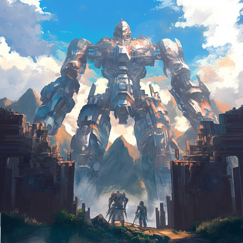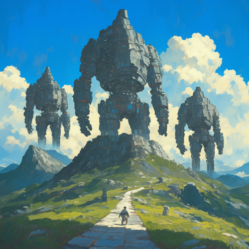 "A path stretching toward a distant mountain, guarded by three enormous robotic titans standing in formation. The middle titan, larger than the others, commands the center. The titans are clearly mechanical beings, with the mountain standing far behind them, unreachable without passing through their robotic blockade. The mountain and titans are distinct, separated by the path ahead. Berserk style --niji 6