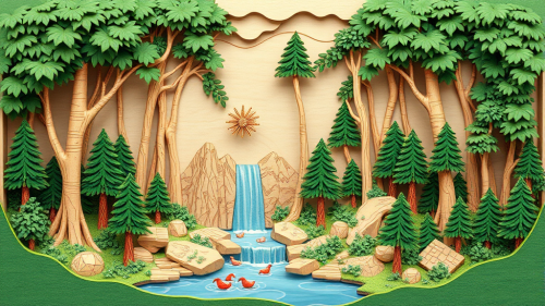 A carpet design inspired by a lush mangrove forest, featuring intricate patterns of intertwining roots and branches reaching into calm, blue-green water. The scene includes stylized mangrove trees with vibrant green leaves and deep brown roots, along with tropical birds, fish, and crabs nestled among the trees. The color palette is natural, with earthy greens, blues, and browns to capture the serene and mysterious atmosphere of the mangroves --ar 16:9