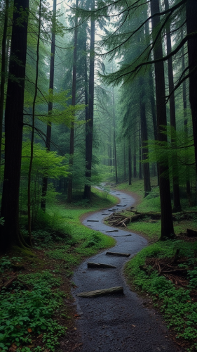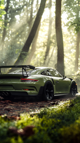 An army green Porsche GT3 RS, parked amidst a dense, misty forest at dawn. The car's matte finish contrasts with the lush, vibrant greenery of the towering pine trees surrounding it, while the ground is covered in a soft bed of moss and fallen leaves. Sunlight filters through the canopy, casting dappled light across the Porsche's aerodynamic curves and large rear wing. The scene feels serene yet powerful, with the car’s muscular stance dominating the peaceful forest. Dewdrops glisten on the car's surface, captured in hyper-realistic detail, as if shot with the Nikon Z9, highlighting the rugged texture of the forest and the sleek precision of the GT3 RS. --ar 9:16