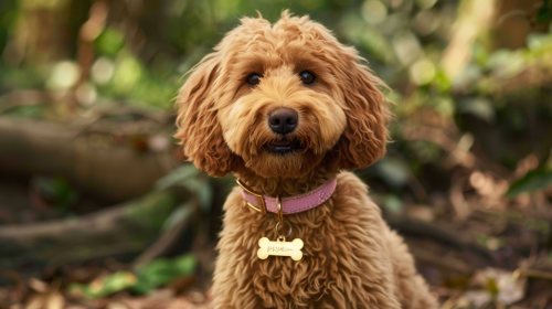 cute goldendoodle in the forest in pixar style from the movie up with pink collar and gold nameplate --no people, houses, balloons, birds --ar 16:9 --v 6.0