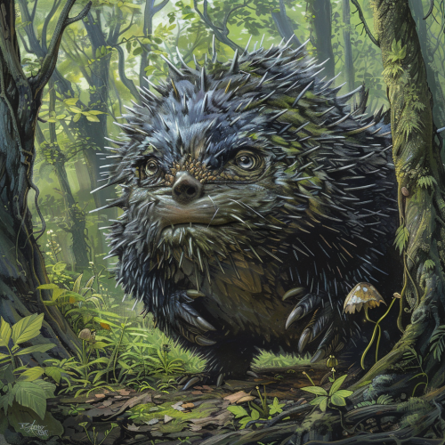 giant goblin porcupine hybrid in the forest, it has a goblin face, in the style of goblin academia, changelingcore, goblincore, mottled, depicts real life, frayed
