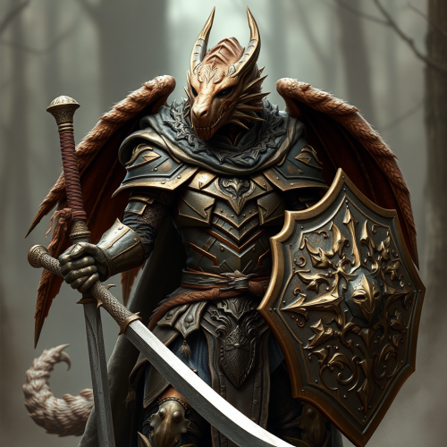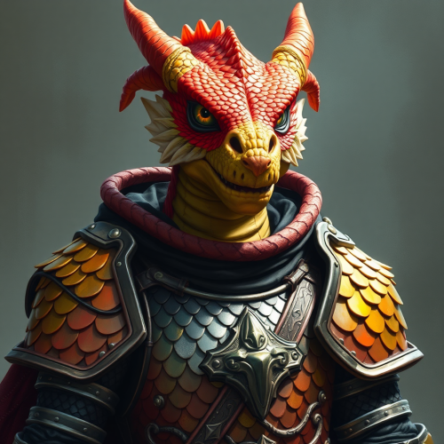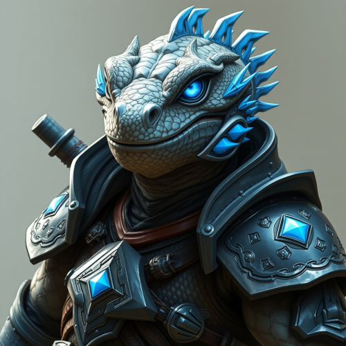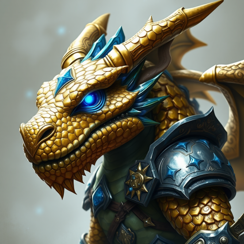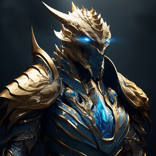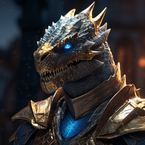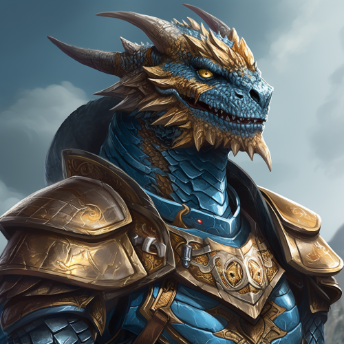 a gold scaled dragonborn warrior with blue accents on his scales and strong glowing blue eyes