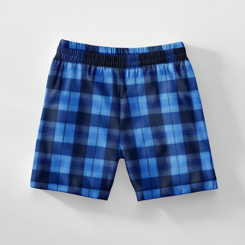 "Create a realistic, highly detailed image of girl pajama short pants with a plaid pattern in shades of blue and dark blue. The fabric should appear soft and comfortable, showcasing the crisscrossed plaid design clearly. The pants are displayed against a bright, clear background with minimal distractions, allowing the vibrant plaid pattern to stand out. The lighting should be soft but bright enough to highlight the texture and colors of the fabric. The background is bright and clear white