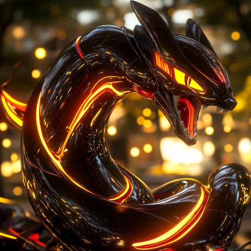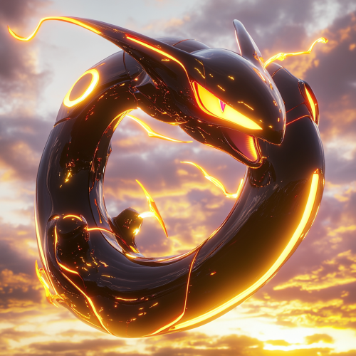 A hyper-realistic scene of a black shiny Rayquaza coiled in the sky during golden hour. Its sleek, metallic body is highlighted by neon-like glowing yellow and red ring markings. The smooth, segmented armor-like sections of its body wrap around in a powerful coil, and a vibrant yellow energy beam is forming in its open mouth, ready to strike. The sunset light glows against Rayquaza's reflective surfaces, casting long shadows and adding dramatic depth. HDR lighting brings out the contrast between its smooth, dark form and the glowing energy and markings.