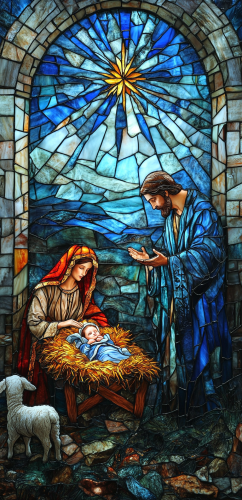 A blue colored star shines above the manger, with Mary and Joseph looking down at baby Jesus in his cradle. The background shows an arched window with intricate details, surrounded by a soft white glow. There is one lamb standing next to them. The stained glass artwork features white light, bright colors, a rich background, and is presented in high resolution in the style of stained glass. --ar 13:27 --stylize 250 --v 6.1