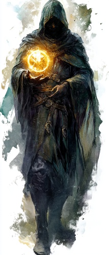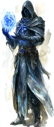 realistic picture of The Veil is an enigmatic figure, rarely appearing in a solid form. When visible, they take the shape of a tall, shadowy silhouette, their form slightly translucent and always shifting, with wisps of dark mist curling around them. Their face is obscured by a black hood, with only faint, glowing silver eyes visible, adding to the aura of mystery. Their attire is flowing, made of dark, shifting fabrics that seem to merge with the shadows, making it difficult to tell where their body ends and the darkness begins. Their movements are fluid and ethereal, as though they are not entirely bound by physical laws. They carry an ancient staff decorated with shards of obsidian and silver, signifying their status among the Shadelings.