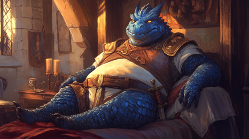 overweight dragonborn character with blue scales, sweet face, sitting exausted on a bed in a medieval inn, wearing doublet, style of video game art, style of video game character dnd, --ar 16:9