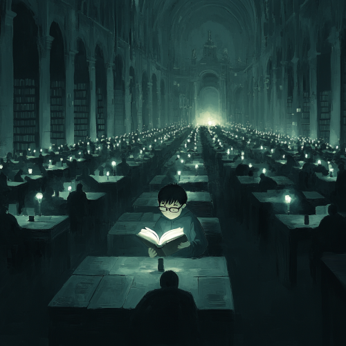 A vast, dark library stretching endlessly, filled with millions of students sitting at long tables, each holding dark, muted books. The entire scene is in dull, grey tones, creating a somber, lifeless atmosphere. In one corner, away from the center of the image, a single student with glasses holds a bright, glowing book. This book is the only source of light in the entire library, casting a warm glow on the student’s confident face. All the other books are dark and muted, blending into the dim surroundings, while only this one book glows vibrantly.