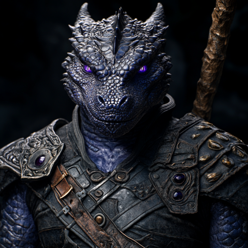 a male dragonborn, beefy, dark blue skin with scales, purple eyes, sapphires run through his body, leather armor, a huge staff on his back, dark fantasy style, hight quality, dynamic lighting