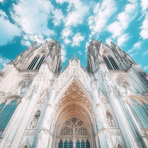 an image of the sparkling white Cologne Cathedral, with a blue sky and clouds in the background. The Gothic architecture exudes grandeur, showcasing its towering spires, intricate carvings on the walls, and large stained glass windows.