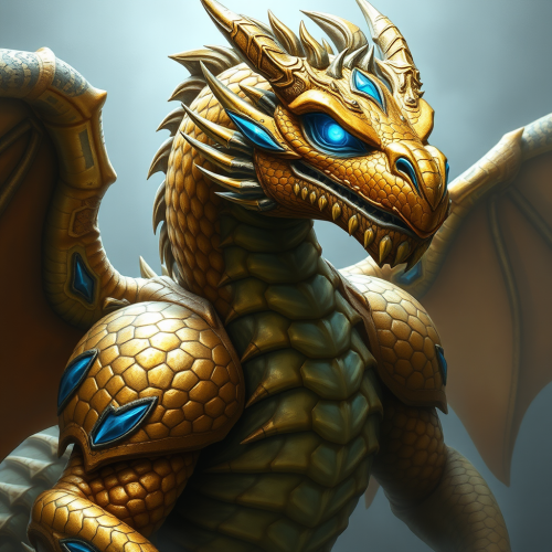 a dragonborn with gold scales and blue accents and strong glowing blue eyes