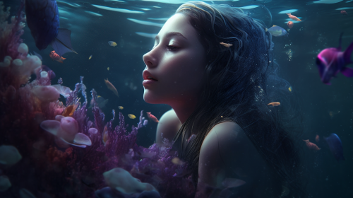 A beautiful mermaid in profile, with delicate facial features and flowing hair, bathed in warm, soft underwater light. She gazes at a softly glowing silver pearl in front of her. The scene is dreamy and serene, with golden and gentle blue tones illuminating her face, highlighting her gentle expression. Surrounded by pink coral and soft bubbles, creating a peaceful underwater atmosphere. Highly detailed, photorealistic, cinematic lighting, ethereal and enchanting. --ar 16:9