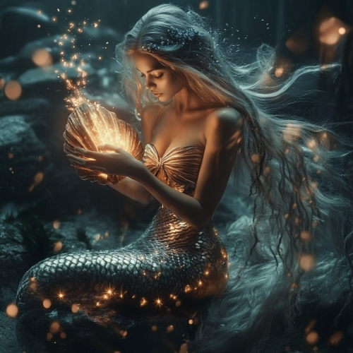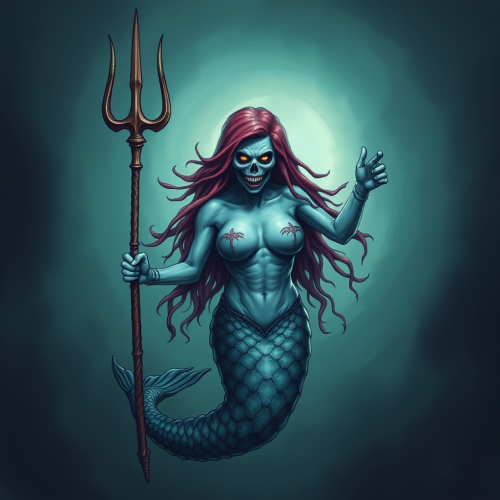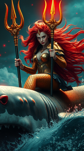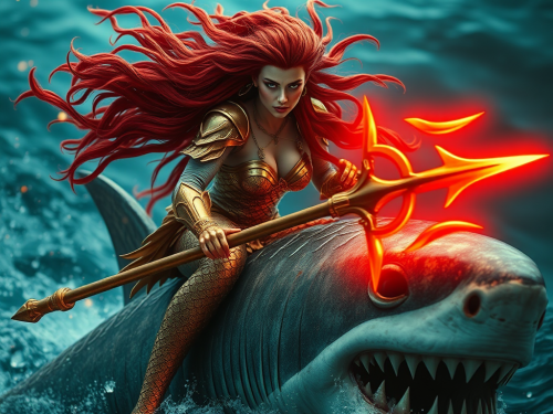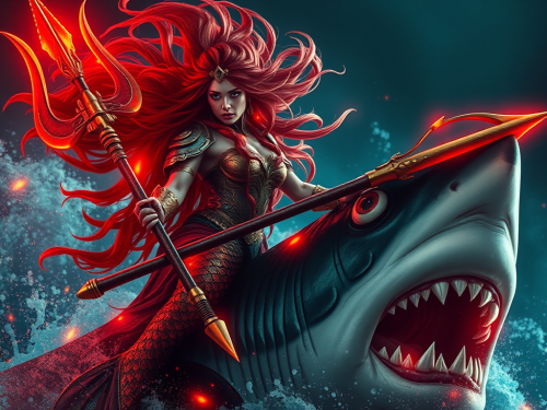 Ultra-cinematic photo: a fierce, mesmerizing mermaid in Atlantean armor riding a colossal monster, a cross between a great white shark and a fairy, dressed in a stylized nautical-themed costume with golden scales. He holds a trident called the trinity that is surrounded by bright, glowing red and orange lights. This weapon has a serrated blade and emits glowing beams, giving the impression of a powerful and magical weapon. The character is partially visible, but the focus is on the weapon and its effects symbolizing its whistling magic, symbolizing power and military might, clutching its dorsal fin in an elegant yet commanding grip. Her long, cherry-red hair flutters wildly behind her, tangled and fluttering like a dark flag in the turbulent currents of the deep. A pair of piercing, icy blue eyes shine with a dangerous intensity, shimmering with hints of mischief and madness as she surveys her watery domain. Her beauty is striking, almost frightening. High cheekbones and full lips give her a regal appearance, while the sharp, almost predatory features hint at the danger lurking beneath her shining allure. Scales shimmering a mix of sapphire, emerald, and violet cover her lithe body, capturing the dim light that filters through the water and casting vibrant reflections across the dark depths of the ocean. The shark, a towering monster of brute strength, glides through the water with a sleek, terrifying grace, her massive frame shimmering with muscle. White scars crisscross her grey, battle-worn skin, testament to countless encounters with creatures of the deep. Yet under her touch, she obeys her every whim, twisting and turning in perfect harmony with her commands. She grins, revealing a row of sharp, pointed teeth that gleam ominously. With a swift flick of her iridescent tail, she urges the shark forward, sending it hurtling through the water like a torpedo. Together, they cut through the depths of the ocean, a fearsome duo—beauty entwined with raw, unbridled power—leaving a swirling trail of disturbed water and shimmering bubbles in their wake. Swirls of blue and red energy surround them, and neon Atlantean markings highlight their armor.