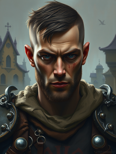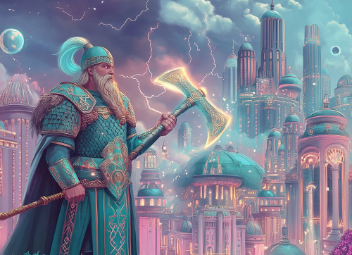In a bustling modern city, a skyscraper rooftop battle unfolds between a rune-covered Viking warrior wielding a glowing axe and a shadowy, magic-wielding figure. Lightning crackles in the stormy sky above, reflecting off the warrior’s ancient armor as neon lights flicker in the distance. --ar 11:8 --p b48zjdo --sref 633