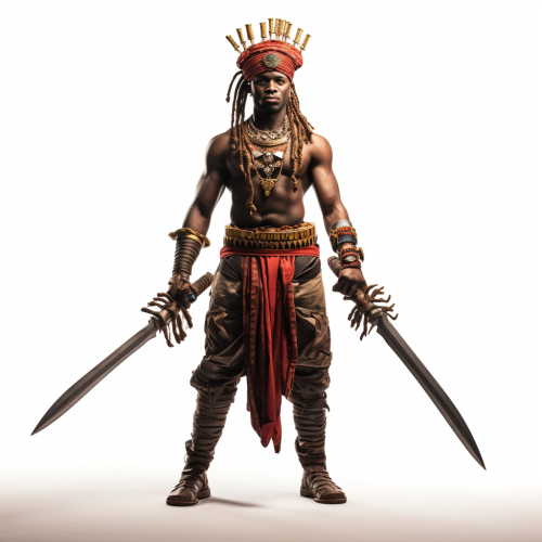 full body shot, African tribal warrior holding 2 swords from an rpg game, voodoo magic, dual sword wielding, white background
