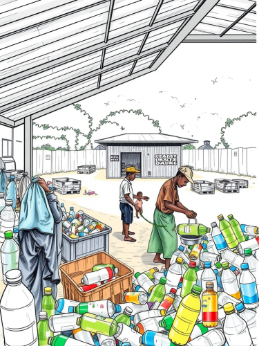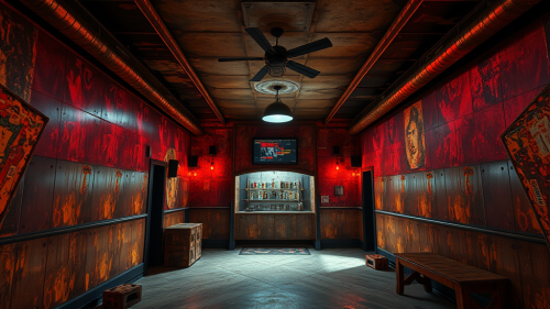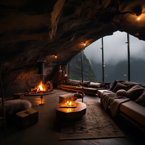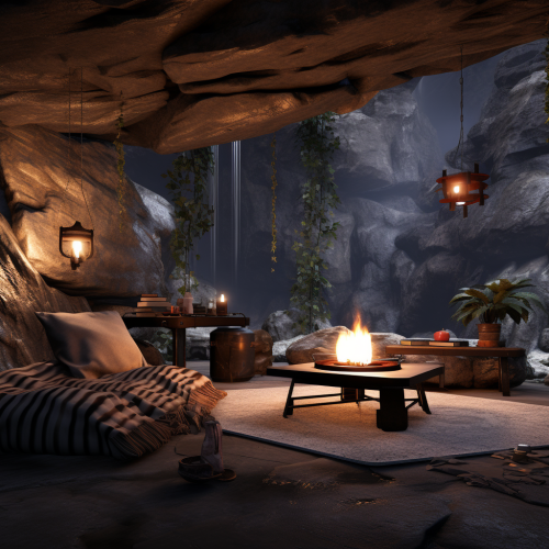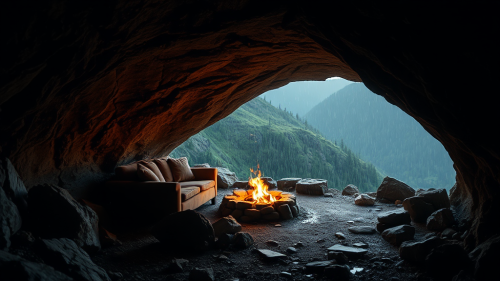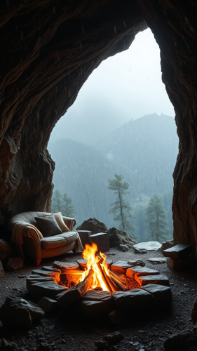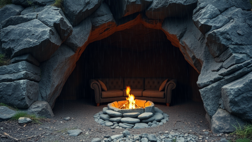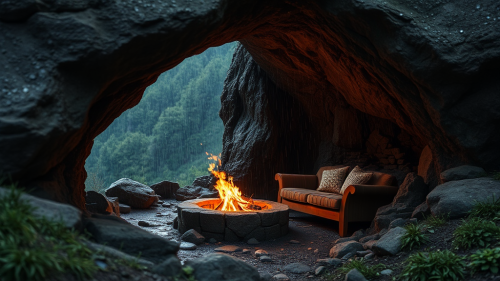 AI, create an image set inside a cave during a rainstorm. The cave provides shelter from the heavy rain outside. Include details such as two bamboo fire lantern holders, a rock firepit with flames, and an L-shaped couch. Place a table with a record player, and ensure the atmosphere reflects the coziness of the cave amid the sound of raindrops. Emphasize the contrast between the sheltered interior and the stormy weather outside