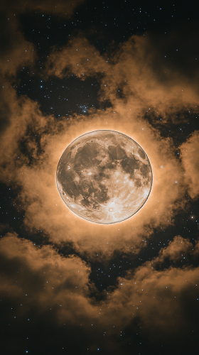 A star-filled sky with a radiant full moon in the center, surrounded by layers of pink and lavender clouds, with stardust shimmering gently in the background--emitting a soft, celestial glow. --ar 9:16 --style raw --s 250