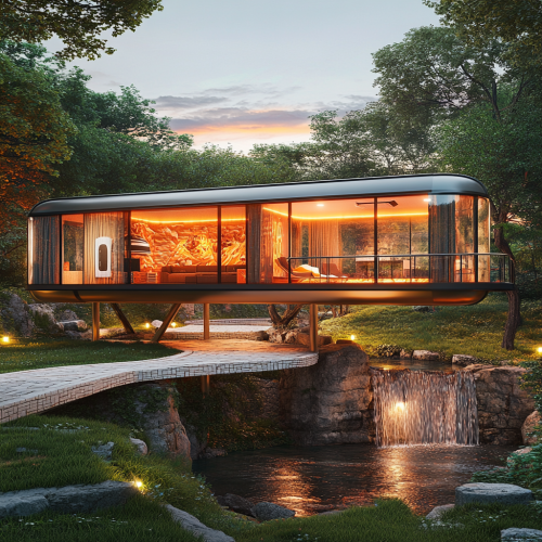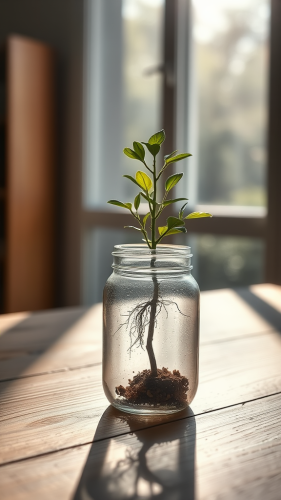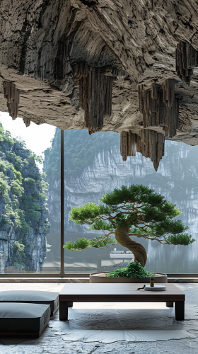 In the Zhangjiajie mountains, a home carved inside a cave, rocky, view from a minimalist living room, bonzai tree. Low-angle Shot in the style of Claude Monet --ar 9:16 --v 6.0