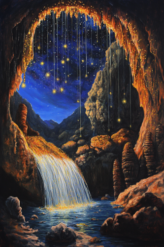 a cave that is full of the light of glow worms, there is a waterfall in the middle coming down and the cave opens up to the night sky where there are stars in the distance also, there are stalagmites, and stalagtites in the cave, its beautiful and curious, it is an oil painting style --ar 2:3
