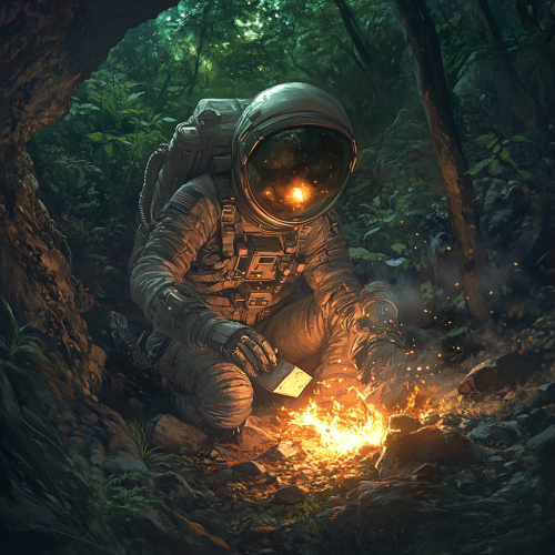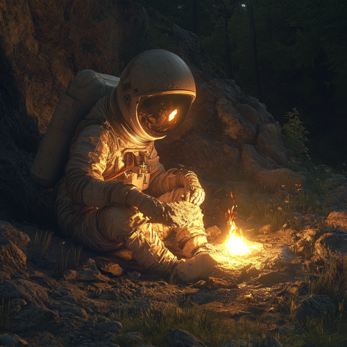 Visualize a female astronaut, with a suit made of fine skins and wearing a helmet, the woman is carving stonework at the entrance to a cave, the area is wooded, in the background there is a small bonfire that provides warm light, it is night, photo realism, ultra high definition