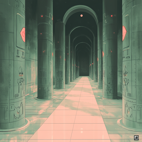 interior of a futuristic aztec temple, glowing aztec symobology, chrome, detailed shadows, ancient architecture, nighttime, teal and red triangles columns --chaos 4 --sref 1994 3880222324 --v 6.1 --stylize 300