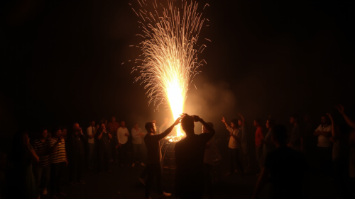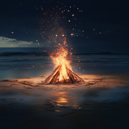 Create a realistic scene of a beach at night, featuring a large bonfire. The fire is roaring, with bright flames reaching upward and sending sparks flying into the night sky. The sandy beach is softly lit by the glow of the fire, with the gentle sound of waves in the background.