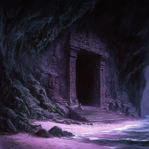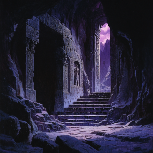 16:9 ratio, darkness, purplish glow, stone temple, cut into the side of a cave wall, a large stone door, wide stairway, intricate carvings, in the style of Brom.