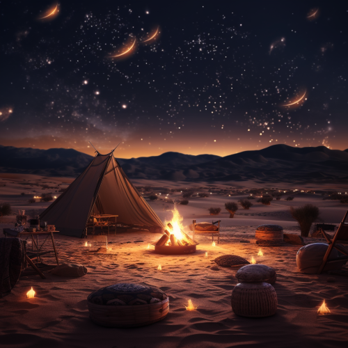 Festive night in the desert with an overview of an endless desert, under mesmerizing stars with Bonfire, Nice set up with lights