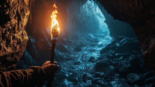 Detailed shot of the fire on the torch, detailed fire, holding a torch, night, inside a cave, shadows, see the shadows on the cave --v 6.0 --ar 16:9