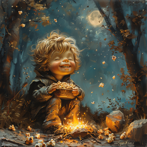 a rock kid living in the forest for a long time, with rock texture on him, he has a happy and cute expression, with a smile of a Jung kid, he es sitting next to a bonfire with a casserole and popcorn cocking and jumping from it, he is in a beautiful forest with the moon and a celestial sky full of stars --v 6.0 --s 750
