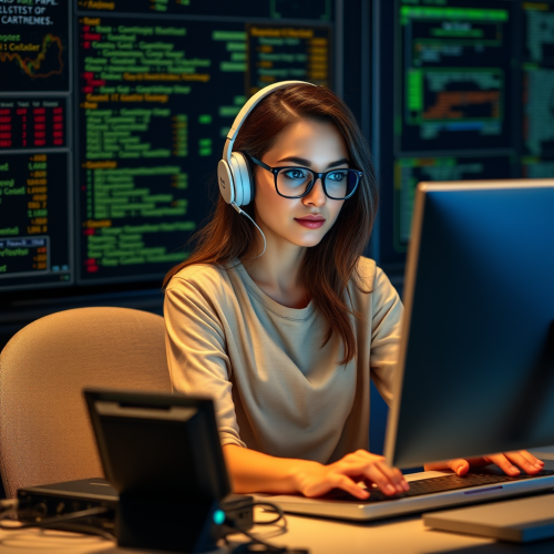 Generate a digital art for A digital art scene showing a person at a desk with multiple computer screens, each displaying different coding solutions. The background is a deep #0D2B52 color, with subtle hints of code snippets floating around. The person is thoughtfully evaluating each solution, with a focus on time and space complexity. The atmosphere is one of concentration and analysis, with a futuristic and tech-savvy vibe. --ar 2:1