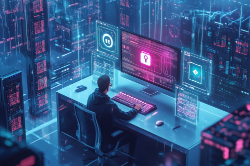 Create a realistic image symbolizing data protection. Show a person working on a computer with a lock icon on the screen, surrounded by holographic shields, secure servers, and encrypted data streams. The environment should convey security, privacy, and trust, with muted lighting and a professional, high-tech atmosphere. --v 6.1 --ar 3:2