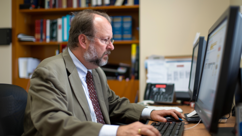 Generate a digital art for A digital art scene depicting a person overwhelmed with work, surrounded by stacks of papers and a computer screen filled with tasks, symbolizing excessive workload. The background should be in light gray color. --ar 1:1