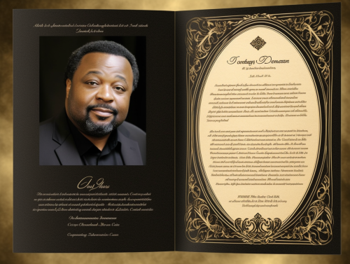 minimalistic, upscale, extraordinarily upper class black funeral program for an otherworldly handsome lightly tanned 50 year old biracial Black upper classed patrician, studio lighting, vibrant color, detailed, intricate design, upscale design, extremely upper class design, --ar 4:3 --v 5.0 --s 1000 --c 19 --w 1
