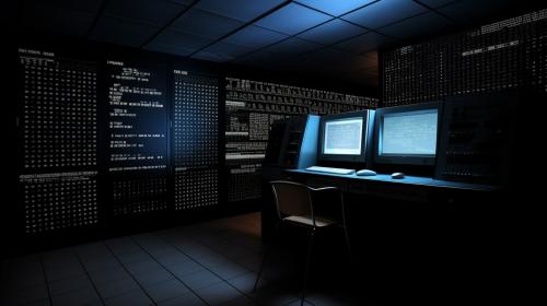 IT professional working on personal computer with monitors showing coding language program. Data center technical room back view --ar 16:9