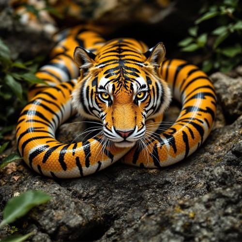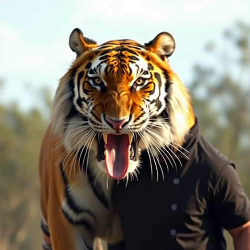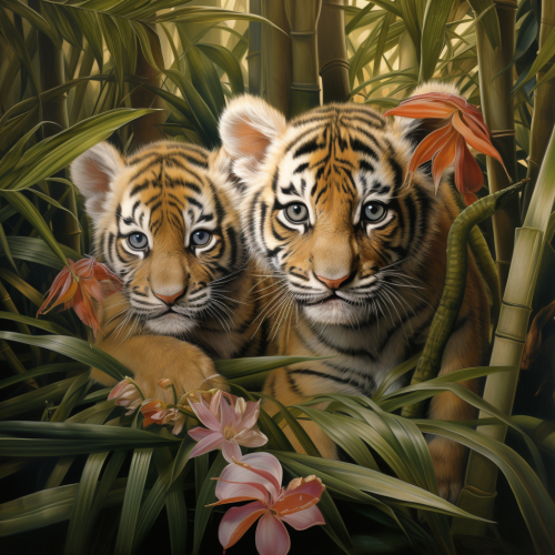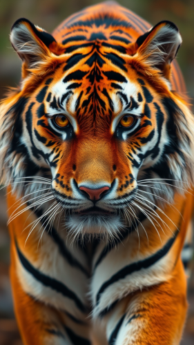 A highly detailed and hyper-realistic depiction of a majestic Bengal tiger, positioned in a regal stance amidst a dense, mystical jungle. The tiger's fur exhibits intricate patterns and texture, capturing the essence of its wild and untamed nature. Each strand of fur is meticulously rendered to convey a lifelike quality. The focus narrows to the tiger's intense and piercing eyes, bathed in the warm, golden glow of the setting sun during the golden hour. The eyes showcase remarkable sharpness, symmetry, and depth of field, drawing viewers into a captivating gaze that exudes both power and mystery. Surrounding the tiger, the jungle comes alive with vibrant foliage, lush vegetation, and dynamic lighting that accentuates the contours of the majestic creature. The atmosphere is heightened by the cinematic touch, employing post-production techniques to enhance the depth of field, emulate cinema photography, and incorporate elements like color grading for a visually stunning effect. The background features a dark stormy sky, creating a dramatic contrast against the tiger's vibrant coat. The lighting further emphasizes the beautiful back lighting, accent lighting, and global illumination, showcasing the intricate play of shadows and highlights. The overall scene is a masterful blend of CGI, VFX, and SFX, delivering an awe-inspiring, hypermaximalist composition with an exquisite level of detail, akin to a 30-megapixel photograph. --seed 1 --v 5.0