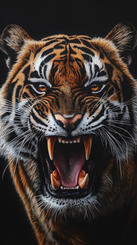 hyperrealistic art with dramatic tones, a roaring tiger with a dark background, wildlife art, extreme close up, intense, detailed, tiger, fur, dark, shadow, texture, contrast, dramatic filter, high contrast lighting, monochromatic colors, dramatic composition, tigers face in foreground, dark background --ar 9:16
