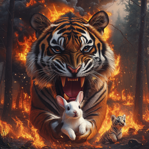 Roaring tiger holding a white rabbit between his teeth, background with burning forest, smoke at the base, In the distance there are two little tigers that run away, hyper realistic, 8k