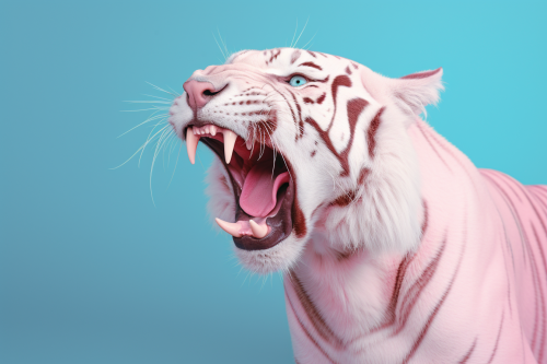 albino tiger roaring isolated on pastel pink background with blue lighting Cinematic lighting, Unreal Engine 5, Cinematic, Color Grading, Editorial Photography, Photography, Photoshoot, Shot on 70mm lense, Depth of Field, DOF, Tilt Blur, Shutter Speed 1/ 1000, F/ 22, White Balance, 32k, Super - Resolution, Megapixel, ProPhoto RGB, VR, tall, epic, artgerm, alex ross, Halfrear Lighting, Backlight, Natural Lighting, Incandescent, Optical Fiber, Moody Lighting, Cinematic Lighting, Studio Lighting, Soft Lighting, Volumetric, Contre - Jour, dark Lighting, Accent Lighting, Global Illumination, Screen Space Global Illumination, Ray Tracing Global Illumination, Red Rim light, cool color grading 45% , Optics, Scattering, Glowing, Shadows, Rough, Shimmering, Ray Tracing Reflections, Lumen Reflections, Screen Space Reflections, Diffraction Grading, Chromatic Aberration, GB Displacement, Scan Lines, Ray Traced, Ray Tracing Ambient Occlusion, Anti - Aliasing, FKAA, TXAA, RTX, SSAO, Shaders, OpenGL - Shaders, GLSL - Shaders, Post Processing, Post - Production, Cel Shading, Tone Mapping, CGI, VFX, SFX, insanely detailed and intricate, hypermaximalist, elegant, hyper realistic, super detailed, dynamic pose, centered, photography --ar 125:83 --s 50
