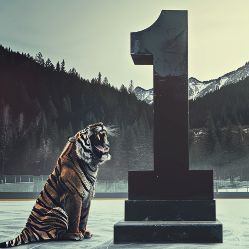 editorial photography giant black color number 1 standing on the ice on middle on hockey arena, huge tiger roar next to number, forested mountain landscape in the background, soft light, eerie symmetry, cinematic liminal space, mundane nostalgia --no people --stylize 55 --v 6.0