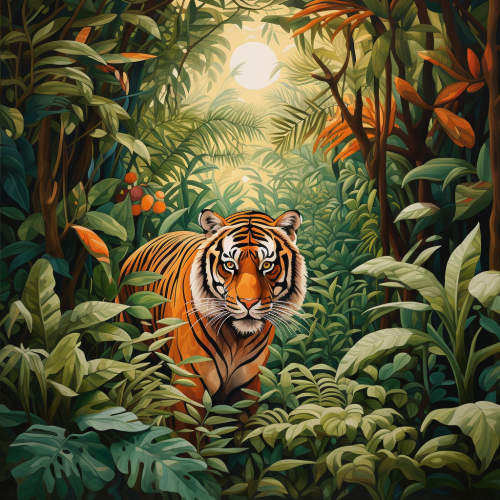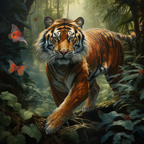 a hyperrealistic large, strong, smart tiger in a jungle with colourul birds flying around and a cameleon