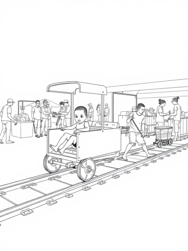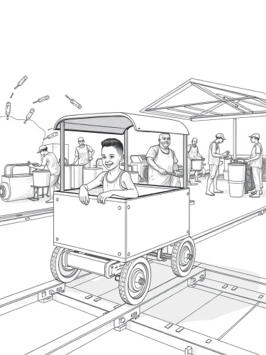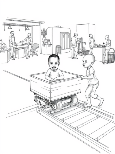 Illustrate a futuristic facility with cartoon robot characters interacting with human characters. Showcase various interactions like working together, playing sports, and relaxing in a park. Storyboarding. gaming facility which integrated AI for children who are creating, choosing and playing games