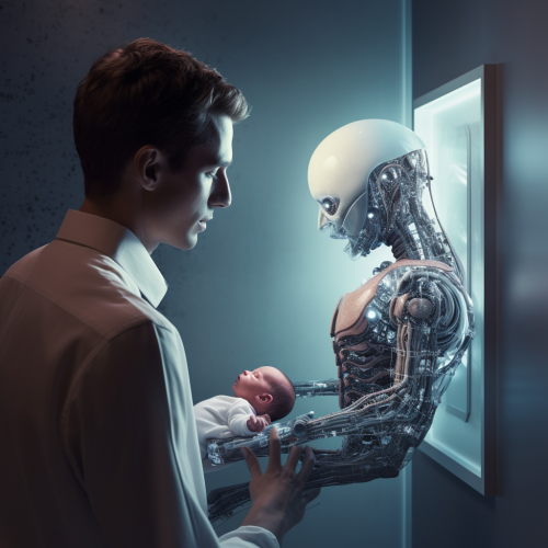 a hyper realistic photo for an AI Newletter where an AI robot gives a newspaper to a highly attractive bald Swedish futuristic middle aged blue eyed man white background. Nikon D850, 85mm lens, f/1.8 aperture --style raw --ar 1:1 --s 250