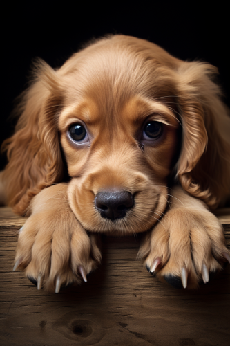 A golden Cocker Spaniel puppy with velvety ears rests its head on its paws, looking up with soulful eyes, begging for a cuddle. --ar 2:3