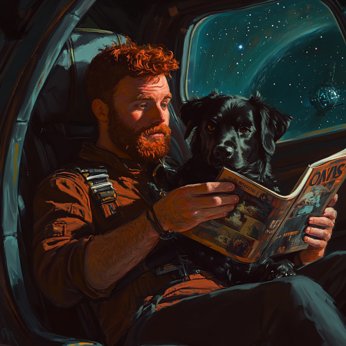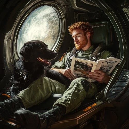 Create an image of a black dog that is a spaniel and shepherd mix on a space ship giving a massage to a red head man with freckles who is reading a Jons magazine, make the entire thing photo realistic