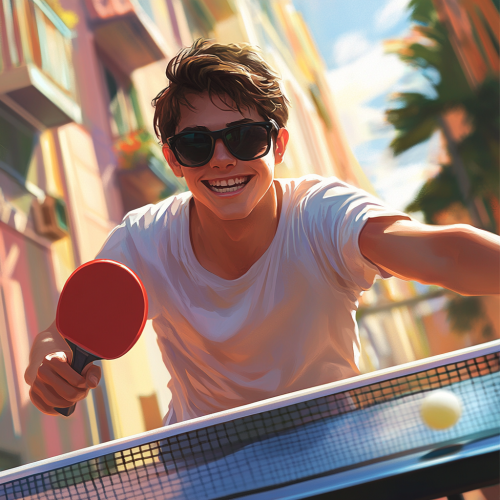 Create a hyper-realistic image of a young man wearing dark sunglasses, smiling as he plays table tennis in a sunny outdoor setting. The man is mid-action, holding a paddle in one hand, his body slightly leaned forward as he focuses on the game. His expression is joyful and energetic, with the sunlight reflecting off his sunglasses. The background is a bright, open space, such as a park or rooftop, with natural sunlight casting warm shadows on the scene. The table and ping pong ball are visible, capturing the dynamic moment of the game. The overall atmosphere is lively and fun, highlighting the man's playful energy and the beautiful sunny day.