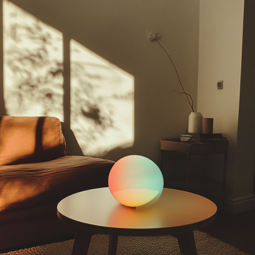 A very small ball, the size of a tennis ball, is on a very small round table. You can see the left wall, the front wall and the ceiling a little. You can't see the right wall. It's all in the living room. The ball projects a movie on the left wall and the ceiling, not on the front wall or the right wall