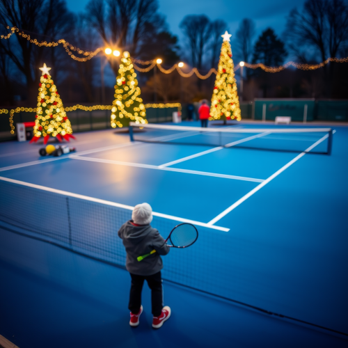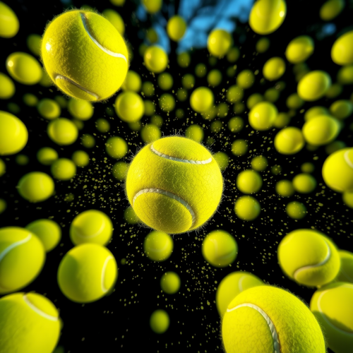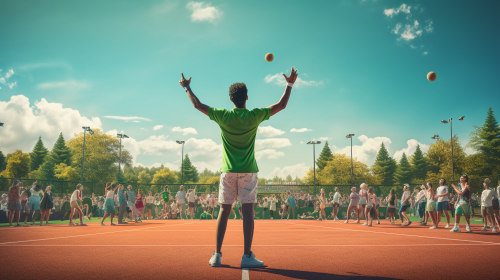 an oil painting of a total of five anthropomorhpized dogs - a border collie dog, a bulldog, a german shepard dog, an english cocker spaniel dog, and a golden retriever dog - and no one else on a tennis court, in action, in the middle of playing a game of tennis, holding tennis rackets, two of them are smoking cigars, looking at the tennis ball, painted from a high angle to see the whole tennis court, in the style of the oil painting Dogs Playing Poker by Cassius Marcellus Coolidge