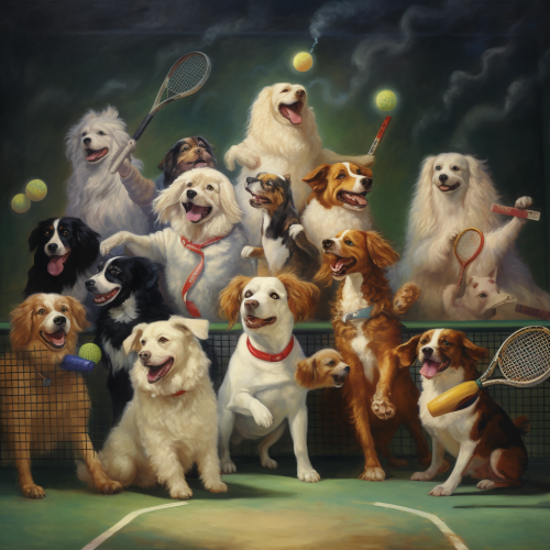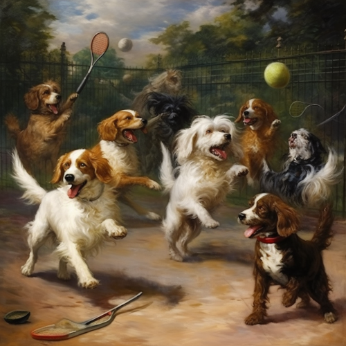 an oil painting from the year 1903 of a few anthropomorhpized dogs - a border collie dog, a bulldog, a german shepard dog, an english cocker spaniel dog, and a golden retriever dog - and no one else on a tennis court, in action, in the middle of playing a game of tennis, holding tennis rackets, some of them are smoking cigars, looking at the tennis ball, not posed, spread out over the court, seen from a high angle, to see the full tennis court, in the style of the oil painting Dogs Playing Poker by Cassius Marcellus Coolidge