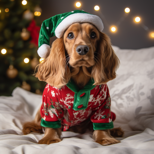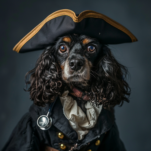 A black and brown cocker spaniel with small nose dressed as a pirate with a doctor’s stethoscope around neck --v 6.0